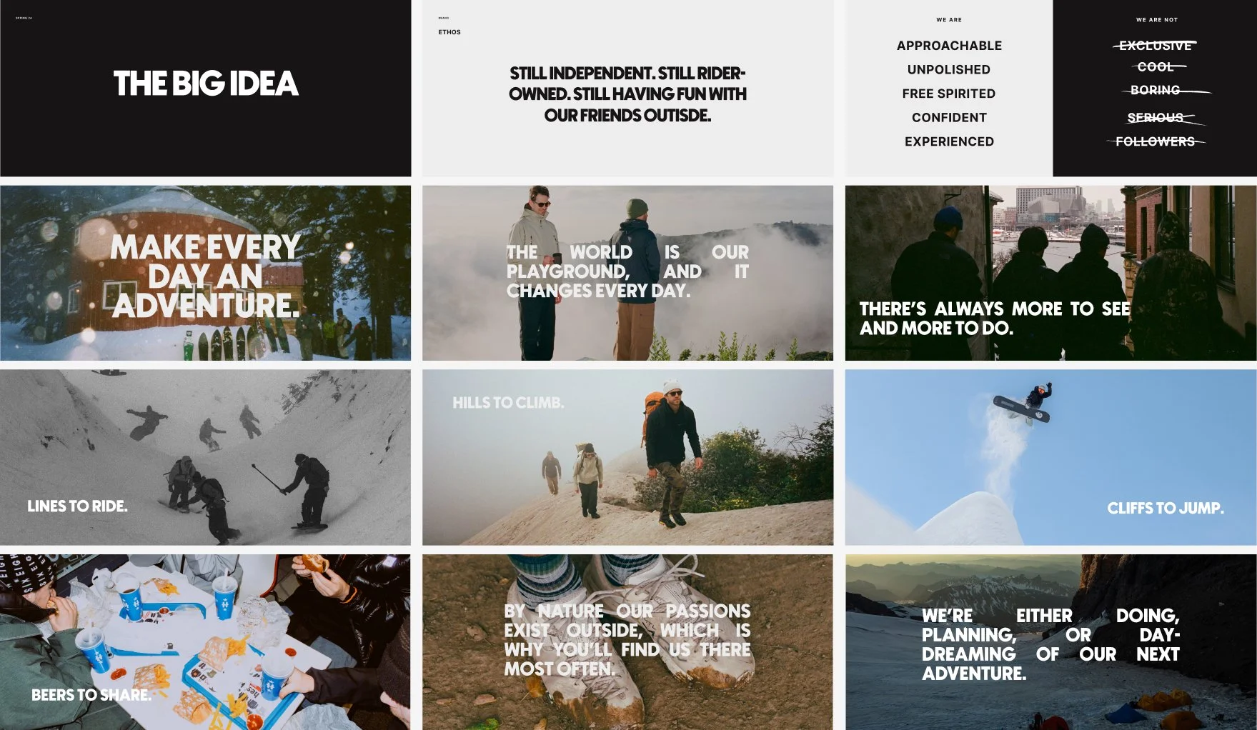I led the creative rebrand to merge the seasonal lines into one cohesive outdoor identity, introducing an outdoor-first creative system that connected snow and lifestyle through shared storytelling and tone. This wasn’t just a creative shift — it reframed how the company saw itself. We moved from being a technical outerwear brand to an outdoor lifestyle brand, aligning every touchpoint, from photography to product copy, under a single, focused direction.