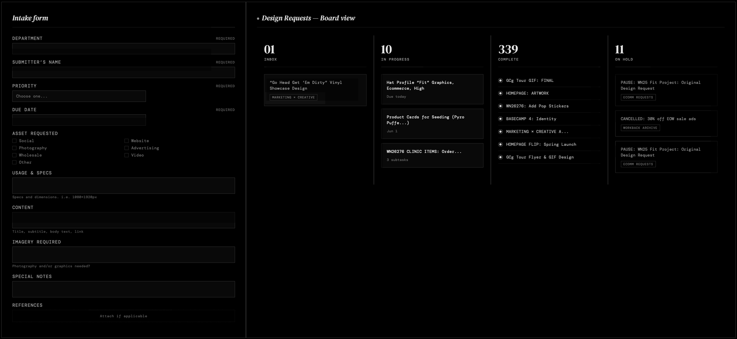 Any department could submit a design request through a structured intake form that routed directly into Asana and assigned to the right designer. No Slack messages, no back-and-forth. 339 completed requests over 3 years from a 3-person team, running parallel to full GTM, catalog, and campaign output.