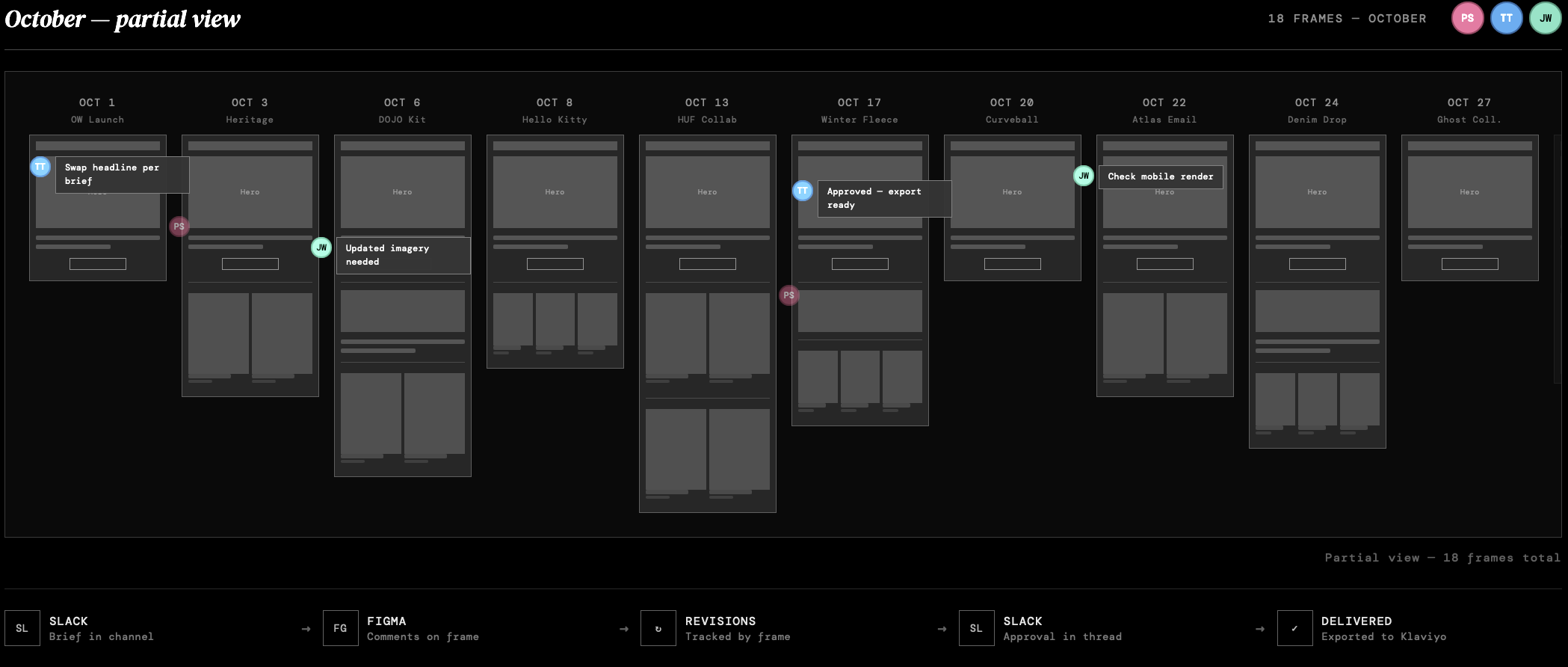 Creative feedback lived inside the file. Comments replaced email chains and shuffling comps, Revisions were tracked, and Slack callouts linked to rounds of revisions — closing the loop between brief, review, and final delivery.