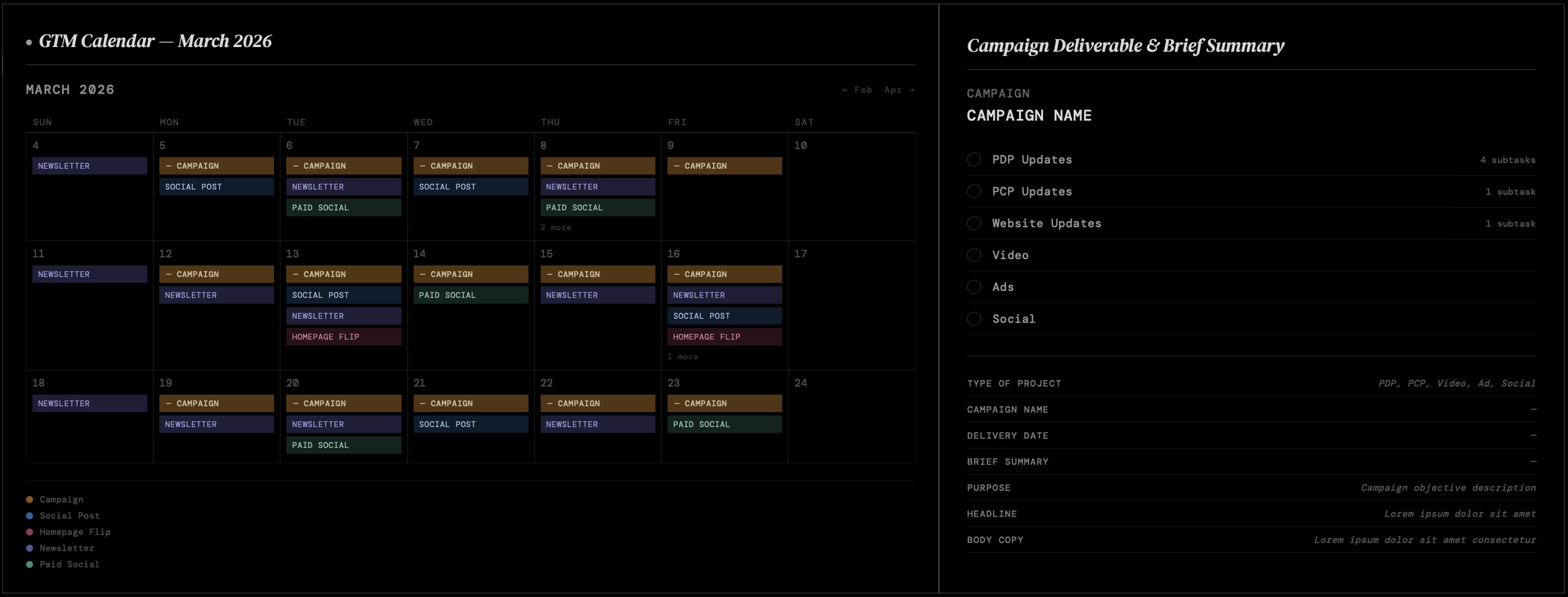 Every campaign started as a templated task inside the GTM Calendar — with pre-built subtask chains covering every deliverable from PDP to homepage to email. The calendar and the brief were the same object. Every collaborator knew what was assigned, when it was due, and where to deliver it.